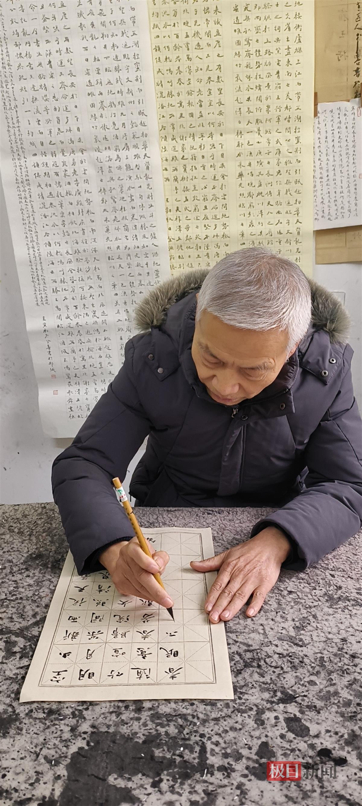 1955年出生的成分喜,从小比较喜爱书法,2015年退休后在家进一步钻研书法。近些年来,他的作品被关注程度不断提高。2011年至2022年连续11年入展武汉市书法篆刻展,并多次获奖,2021年他被评为新洲区乡村人才。2022年书法作品《黄鹤楼赋》夺得黄鹤群星奖。