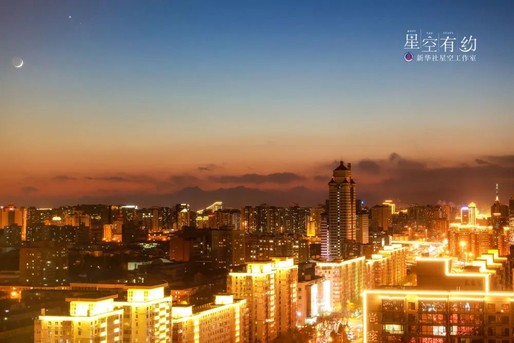 这是北京市天文爱好者王俊峰2023年1月23日在北京市西城区拍摄的“新月抱旧月”。(本人供图)“届时只要天气晴好,我国感兴趣的公众只需寻找适合的地景,凭借肉眼就能欣赏到这幕‘星月童话’,以及‘新月抱旧月’(又称地照,指由于地球表面将太阳光反射至月球暗面,在弯月牙的怀抱中,整个月面隐约可见)现象。”修立鹏说。