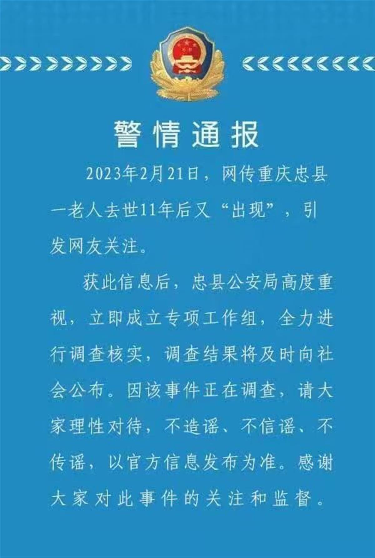 2月21日晚,“忠县发布”官方微信发文称,忠县公安局高度重视,立即成立专项工作组,全力进行调查核实,调查结果将及时向社会公布。