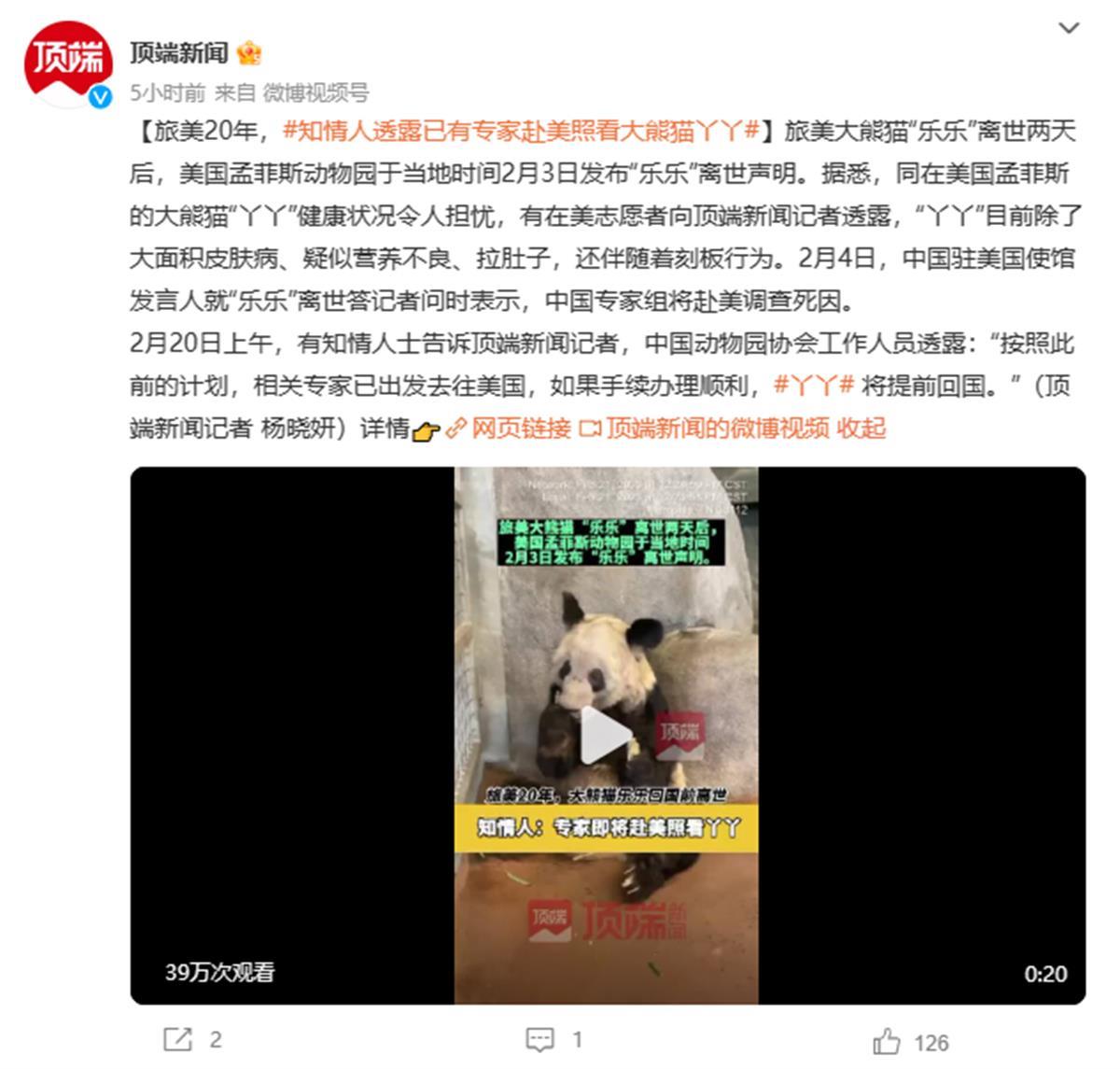 2月20日上午,有知情人士告诉顶端新闻记者,中国动物园协会工作人员透露:“按照此前的计划,相关专家已出发去往美国,如果手续办理顺利,‘丫丫’将提前回国。”