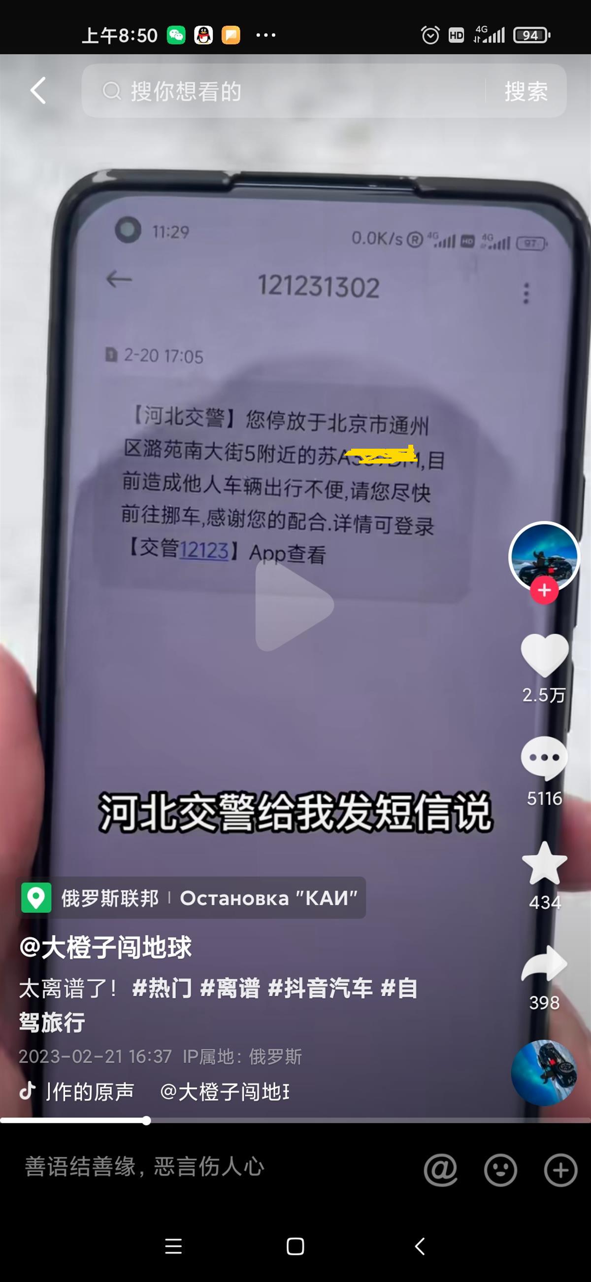 2月21日,一位博主发视频称,他收到一条唐山交警发来的短信,短信称他停放于通州区潞苑南大街附近的苏A33***,目前造成他人车辆出行不便,请他尽快前往挪车。但他人和车明明都在俄罗斯,不知道怎么能挡住了别人的车。