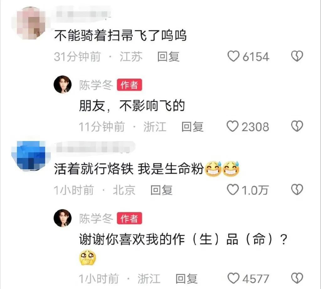 评论区有网友说他不能骑着扫帚飞了,陈学冬回复:朋友,不影响飞的。