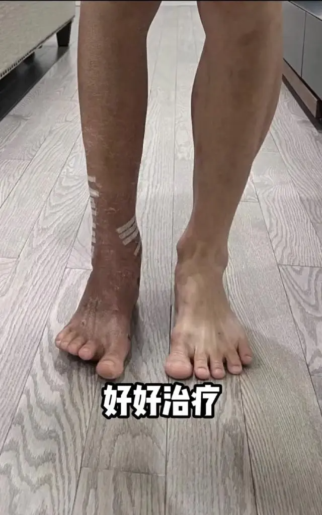 视频中,陈学冬腿上绑着有助于康复固定的医疗器械,好像盔甲一般。他公开了脚部受伤照,不仅脚面大面积淤青发肿,在脚踝处还一连缝了好多针,再加上陈学冬自己透露的打钢钉,其受伤情况可谓十分严重。
