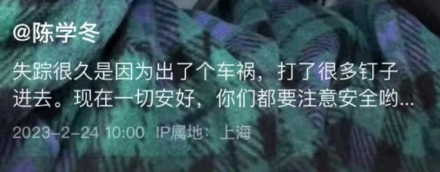 24日,陈学冬在社交平台发布视频称自己遭遇车祸腿受了伤,但脸部没有受伤。他表示目前正在接受治疗积极康复中。