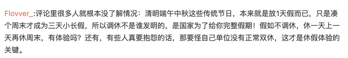 对于该不该调休,也有网友评论一针见血:很多人认为调休体验不好,关键在于平时不能保障双休只能单休,因此,最急需解决的是落实双休日。