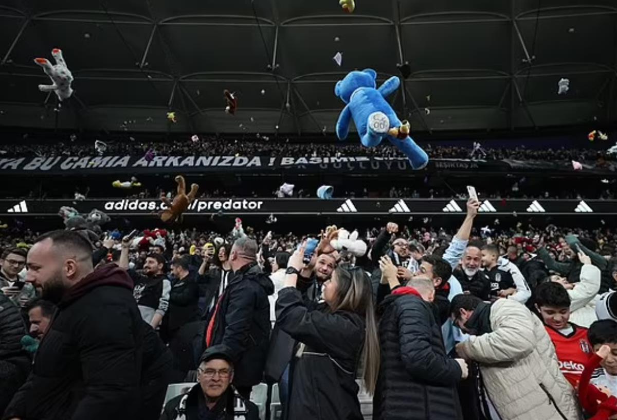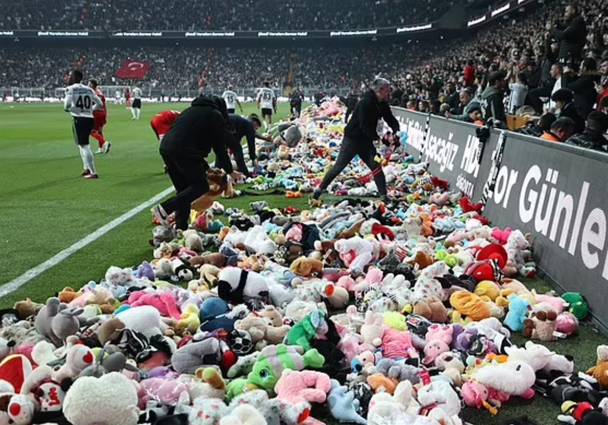 当晚,是伊斯坦布尔贝西克塔斯足球俱乐部对决安塔利亚体育足球俱乐部。赛前,很多球迷将大泰迪熊等毛绒玩具放在赛场的空座位上,随后球迷们将这些各种形状和大小的玩具扔到球场上。球场上堆满了熊、独角兽、兔子和其他动物等玩具,球员们随后冲上球场,收集这些玩具。这些玩具将送给受土耳其两次7.8级强震影响的儿童。