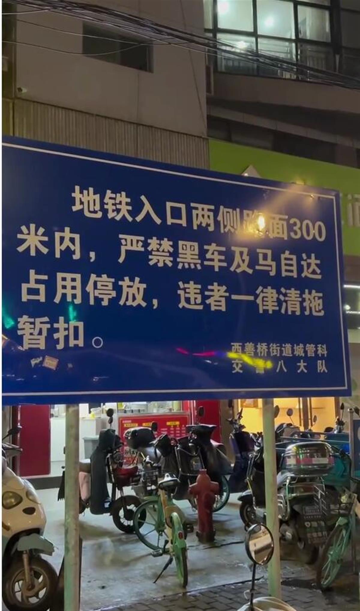 视频显示,马路边一处告示牌上这样写道,“地铁入口两侧路面300米内,严禁黑车及马自达占用停放,违者一律清拖暂扣。”视频拍摄者表示,“有没有本地人告诉我,这个马自达为什么不能停放?”