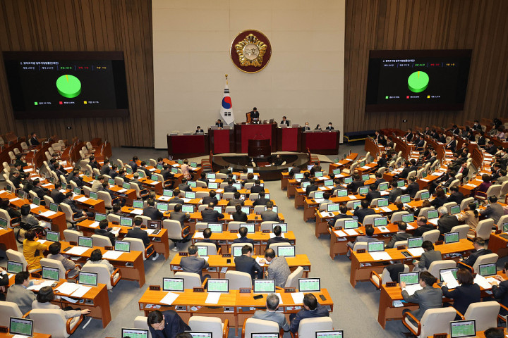 当地时间2023年2月27日,韩国首尔,在国会举行的全体会议上,议员们正在观看对韩国共同民主党党首李在明的拘捕同意案表决结果。