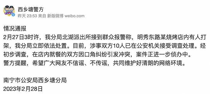 2月28日晚,南宁市公安局西乡塘分局发布情况通报称,27日3时许,该分局北湖派出所接到群众报警称,明秀东路某烧烤店内有人打架,分局立即依法处置。目前,涉事双方10人已在公安机关接受调查处理。经初步调查,在店内就餐的双方因口角纠纷引发冲突,案件正进一步侦办中。
