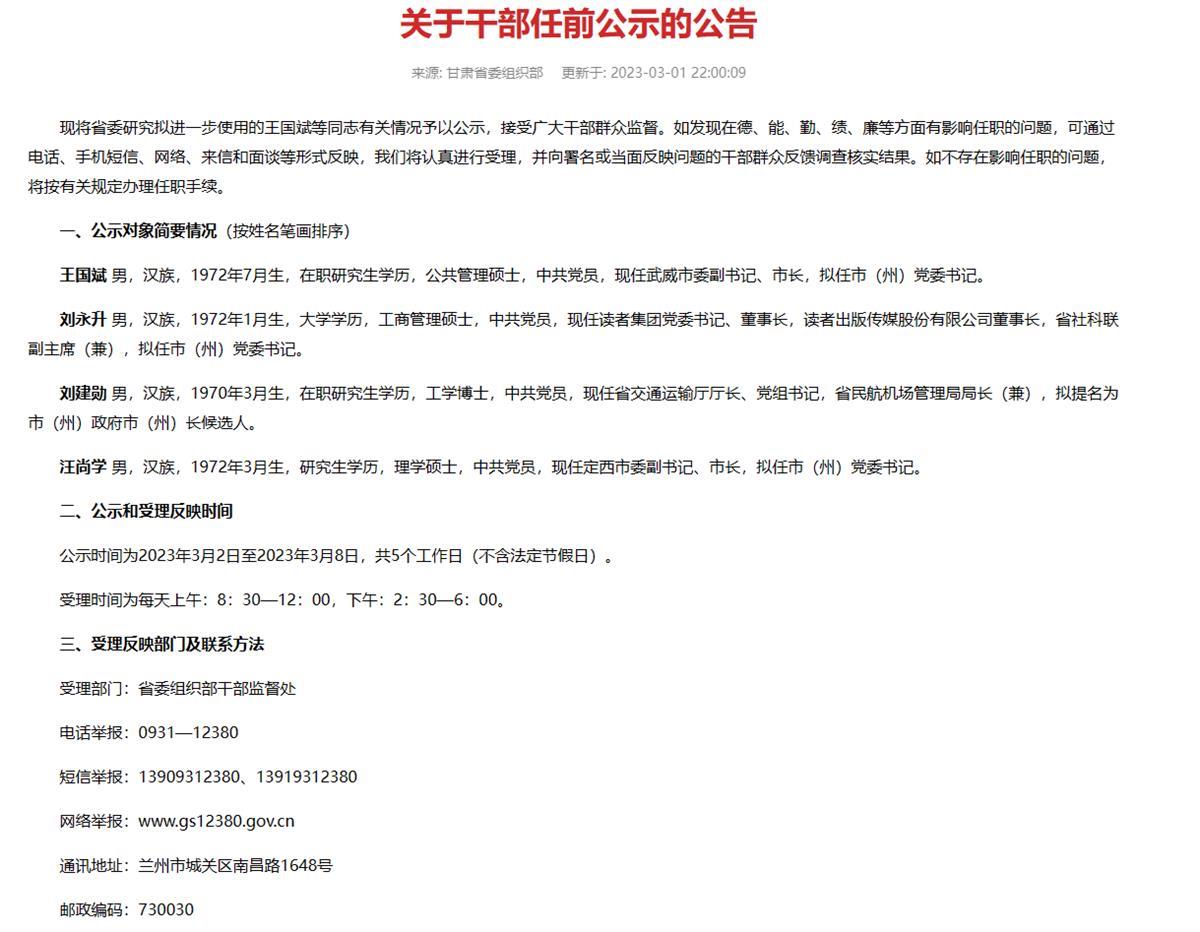 3月1日,甘肃省委组织部发布干部任前公示。其中,读者集团党委书记、董事长刘永升拟任市(州)党委书记。