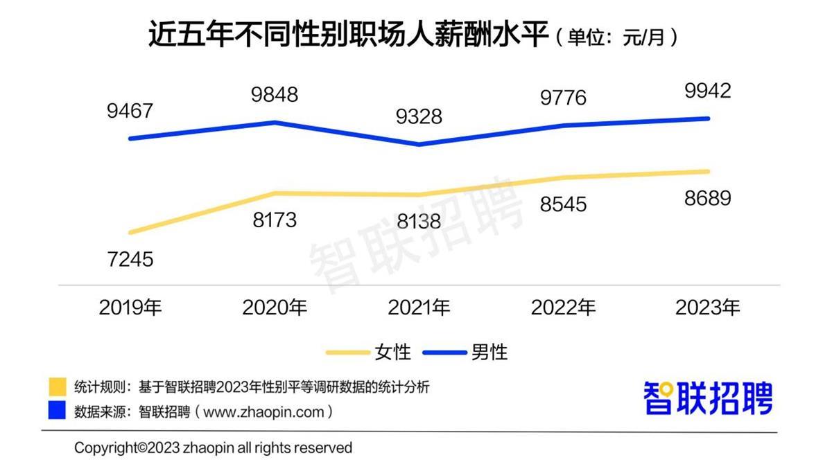 从薪酬来看,2023年女性的平均薪酬为8689元/月,与男性的9942元/月相差1253元,总体来看,男女薪酬差距呈逐年缩窄趋势。2019年,女性比男性月薪低23.5%,2023年相差约12%。一定程度说明女性的职场价值日益得到更多认可。