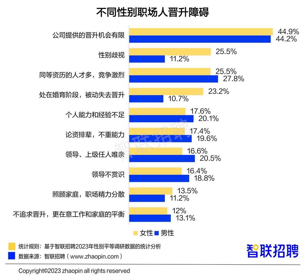 当被问及晋升最大的障碍时,有44.9%的女性认为“公司提供的晋升机会有限”,占比高于其他因素。排在第二位的是“性别歧视”,占比25.5%,明显高于男性的11.2%,值得一提的是,因“处在婚育阶段,被动失去晋升机会”的女性占比高达23.2%,同样大幅高于男性(10.7%)。可以看到,相较于男性,性别和婚育是女性晋升的两大主要障碍。