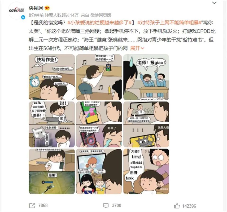 “网梗”甚至“烂梗”已经成为一些孩子语言体系的一部分,“老六”、“鸡你太美”、 “蓝色妖姬”你不爱……有一位老师在留言区评论,上课几乎不敢提到某些字和词,提到学生就会笑;还有偏成人化的制作和表达,也充斥在打着青少年科普旗号的视频中,譬如让许多家长深恶痛绝的“白雪公主和贝儿”系列,过早地把“美丑”、“穷富”还有所谓的“绿茶”等一些概念,灌输给孩子;2分钟看电影系列,也被如法炮制用来“收割”孩子,在一个名为《小猪佩奇发生诡异事件》的视频中,张口就是“注意看,那个房子里还关着一只猪”,真是有那味儿了……吐槽的话说不完,“5G儿童”怎样顺着网线获取成长营养,而非精神“垃圾食品”,是全社会都关注的问题。