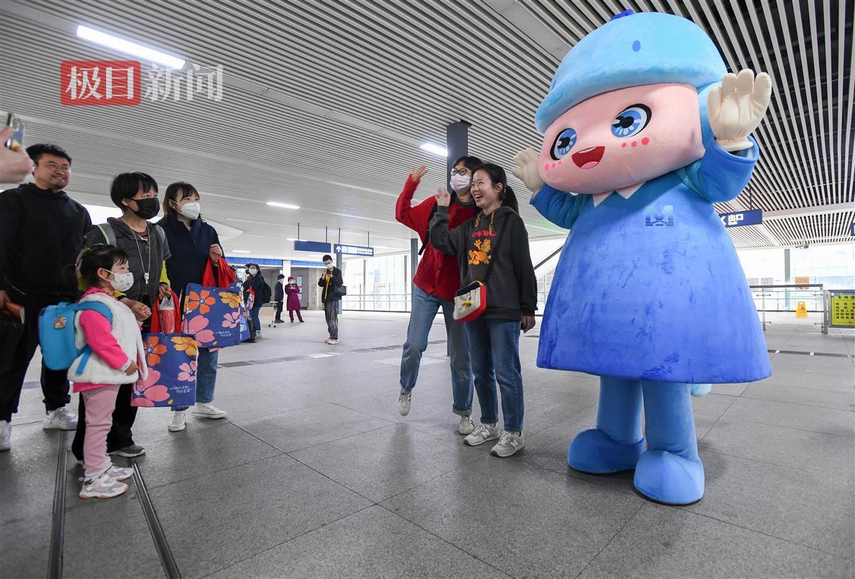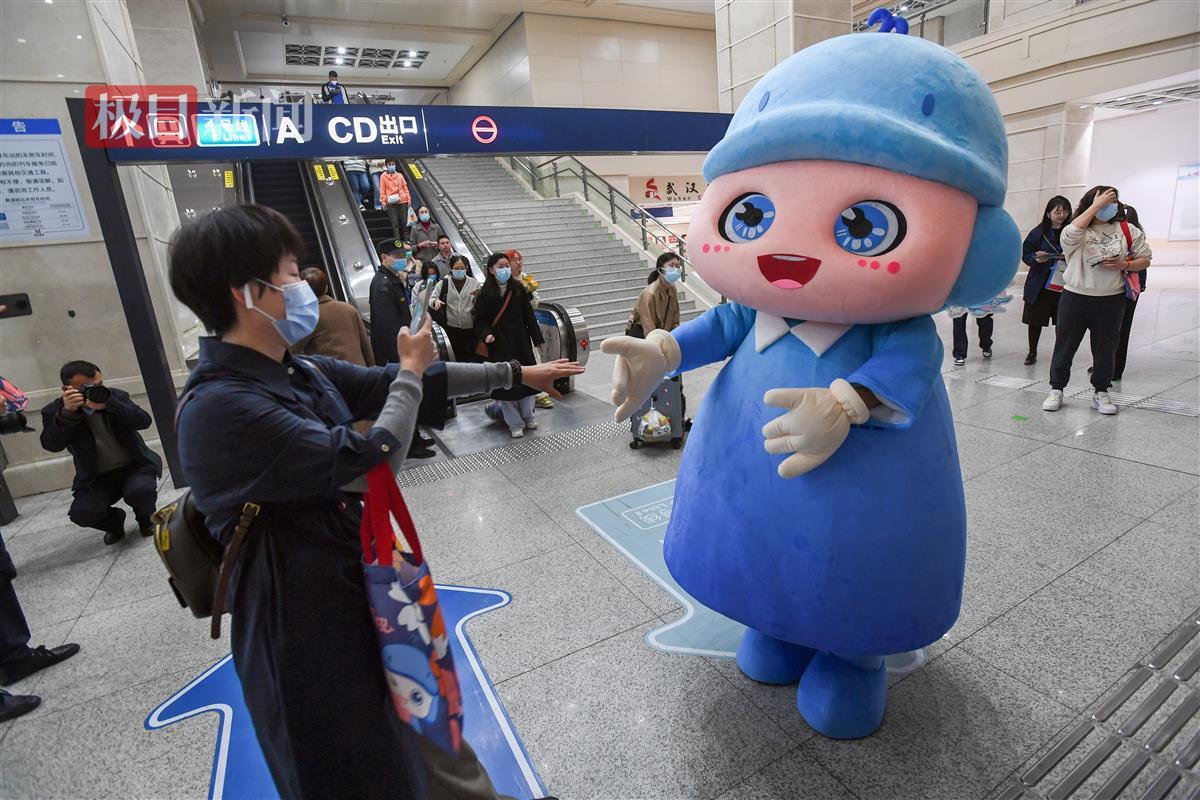 “鱼快快,你好!”上午10时许,华中农业大学的王诗颖和杨婼涵同学来到三阳路地铁站,在换乘通道处找到了武汉地铁“鱼快快”,惊喜地上前合影互动。随即,两位女生领取到了武汉地铁2号线开通十周年限量文创。