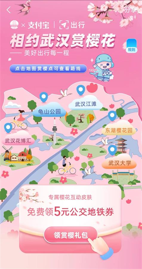 在手机上打开支付宝App,搜索“武汉地铁”,免费领取面值5元的出行优惠券,还有无限量“‘鱼快快’樱花皮肤”赠送。