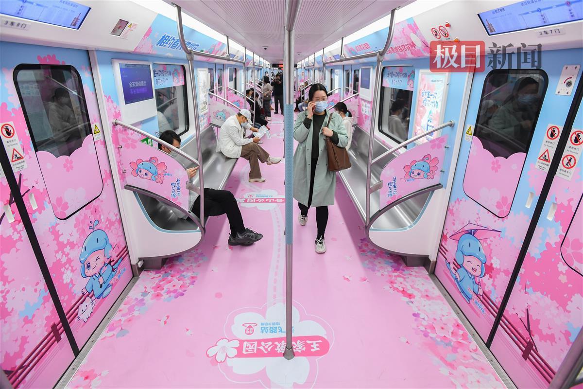 1号线堤角站-堤角公园、3号线云飞路站-王家墩公园、8号线小洪山站-武汉大学、5号线红钢城站-青山公园……登上专列你会发现,车厢地板变身“武汉地铁赏花地图”,一条条地铁线路,串起武汉各处绝美赏樱地,为市民乘坐地铁出行提供了引导。