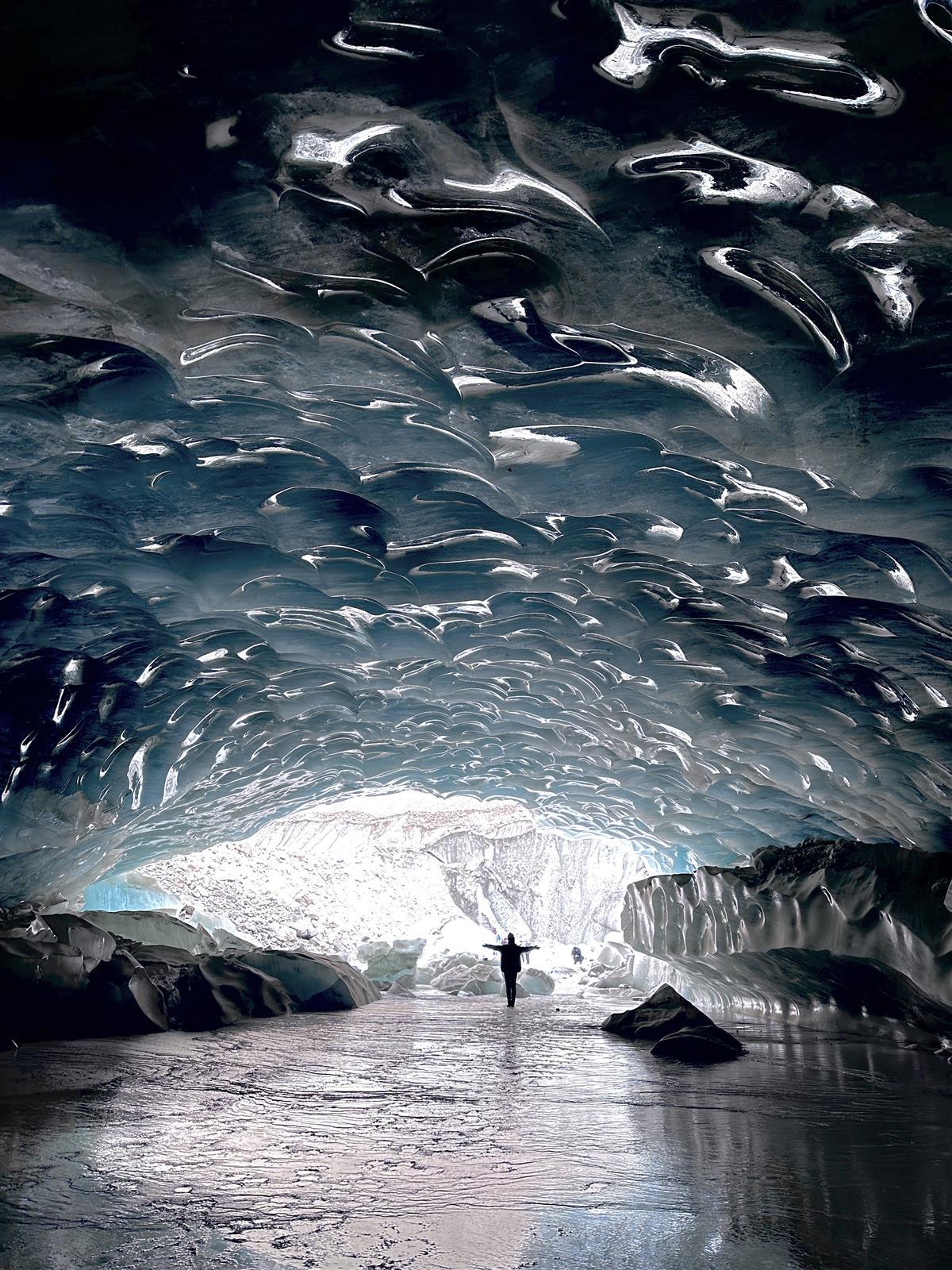 现场视频显示,这个冰洞内部呈弧拱状,内壁皆为冰晶,犹如一个晶莹剔透的水晶宫殿,在阳光的照射下呈现出梦幻般的景象,十分美丽。冰洞外部为雪山、冰川、冰裂缝等景观,十分壮观。