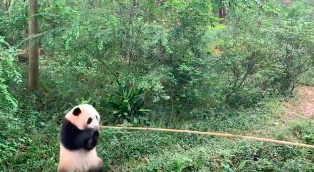 所谓“钓熊猫”就是拿着一根长长的竹竿,竹竿的另一端用竹签插着苹果,像钓鱼一样的往园子里钓熊猫,使其用后肢站立起来。