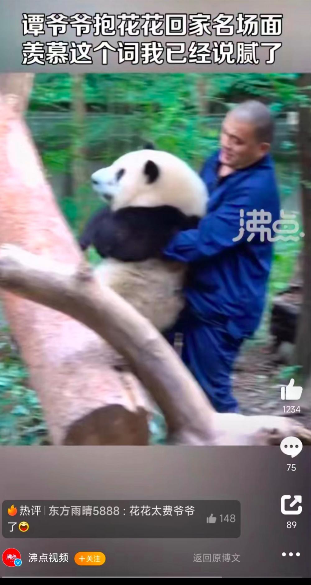 由于花花体重越来越重,在抱它回笼舍的时候,谭爷爷颇费力气,一路上还要歇几口气。昨天,谭爷爷抱花花回家的各种名场面就冲上热搜。