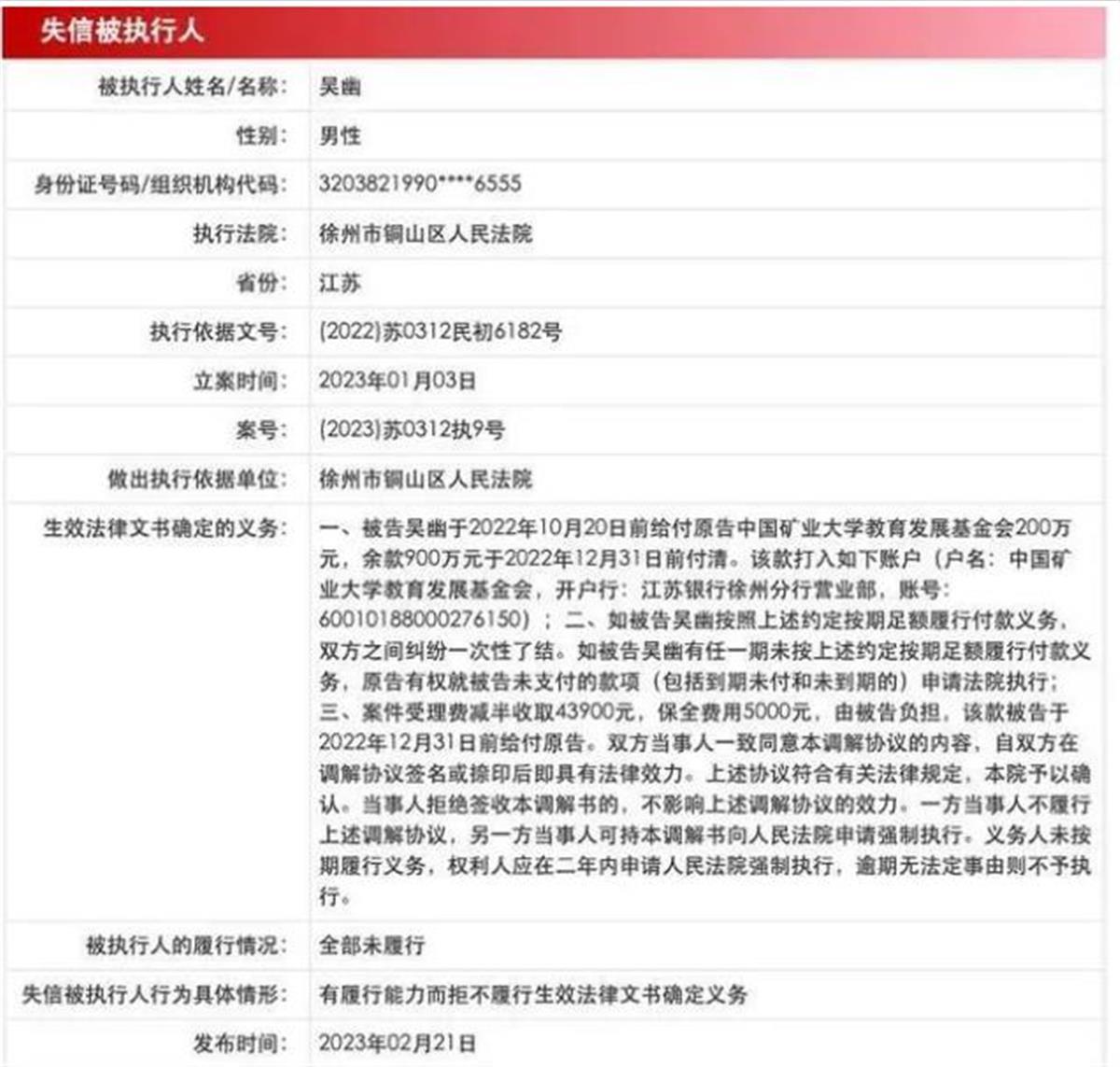 公开资料显示,2022年7月,双方赠与合同纠纷在徐州首次开庭。2023年1月,吴幽被列为被执行人,执行标的1100万余元。2月21日,吴幽被纳入失信被执行人名单,收到限制消费令。