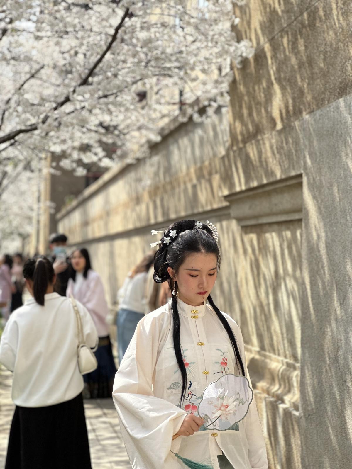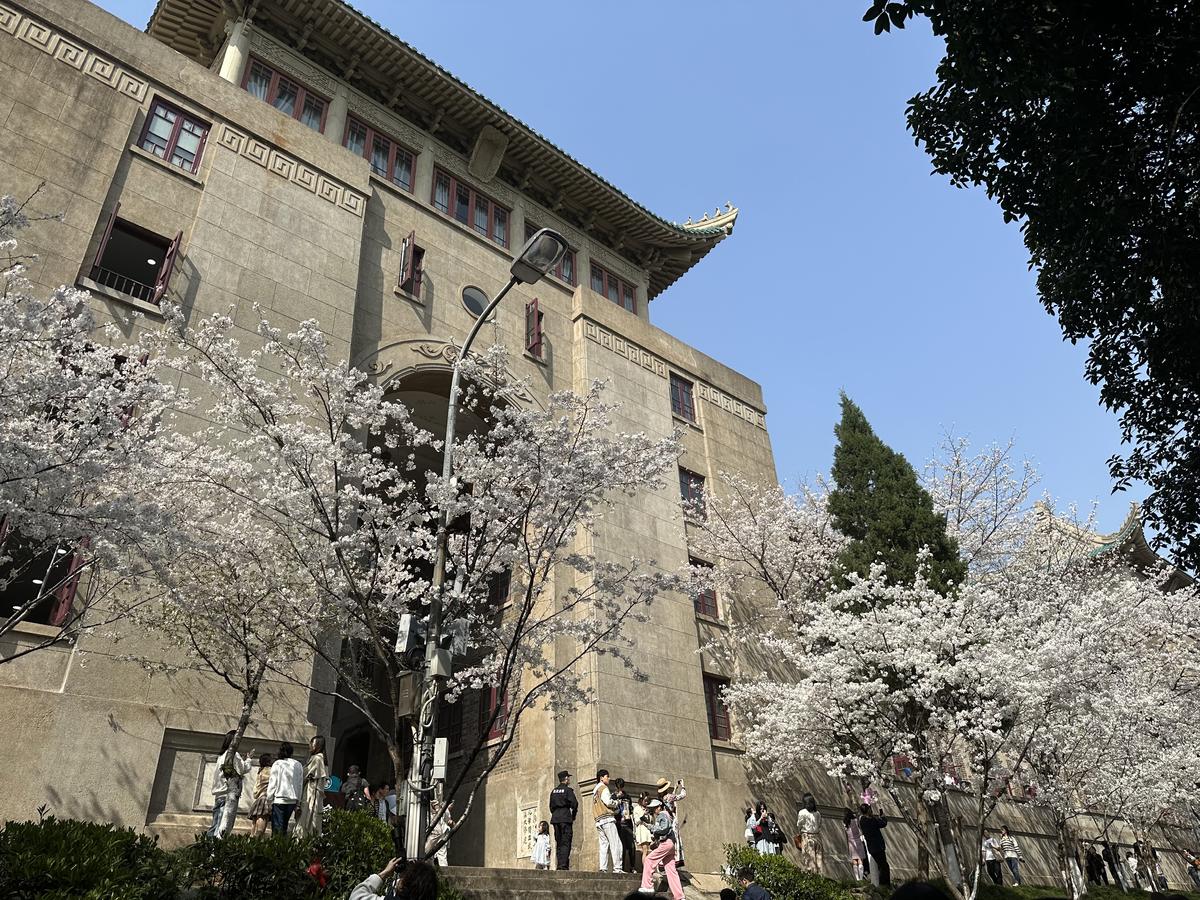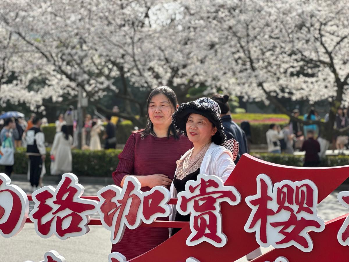 陈颖来自湖南长沙,女儿在武汉大学读大三。趁着春光,她与姐妹相约一同来汉赏樱、探望女儿。早上九点,她与好友在校门口、樱花核心区核验了身份后,顺利看到了樱花掩映之下的樱花城堡,“武大樱花美在人文气息,穿插在这片老建筑之间,非常有韵味。”
