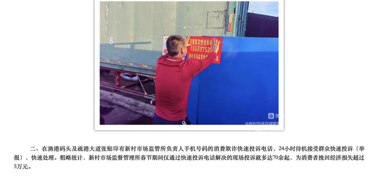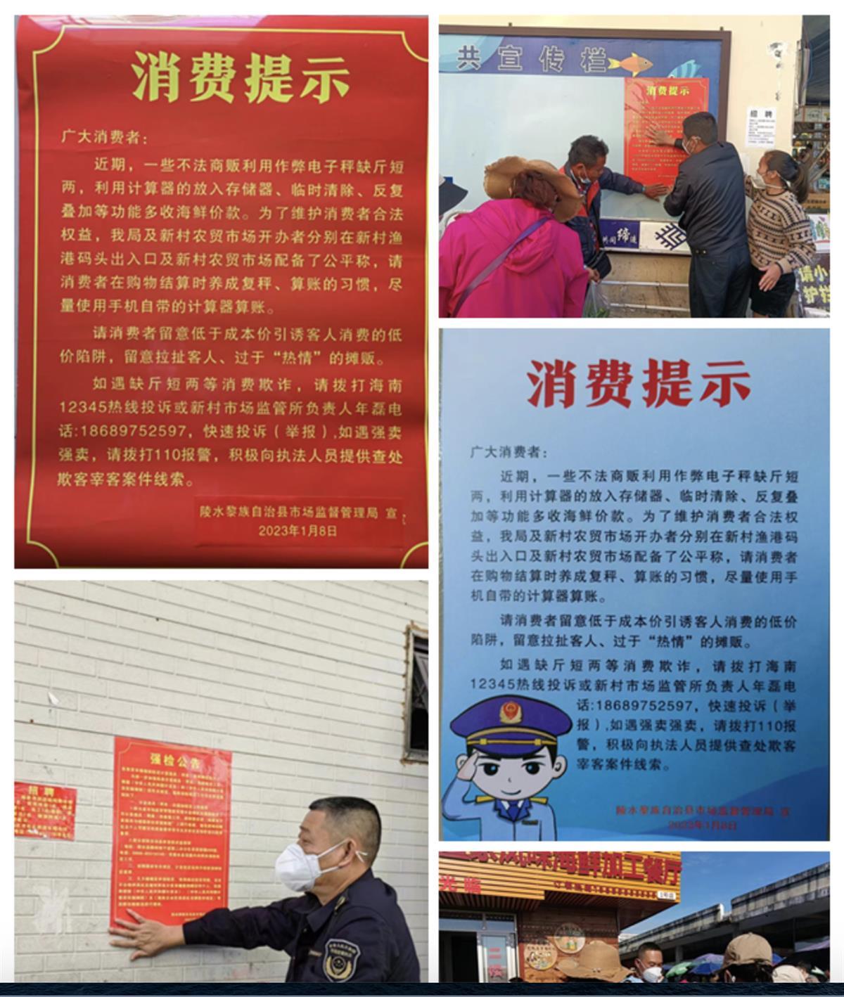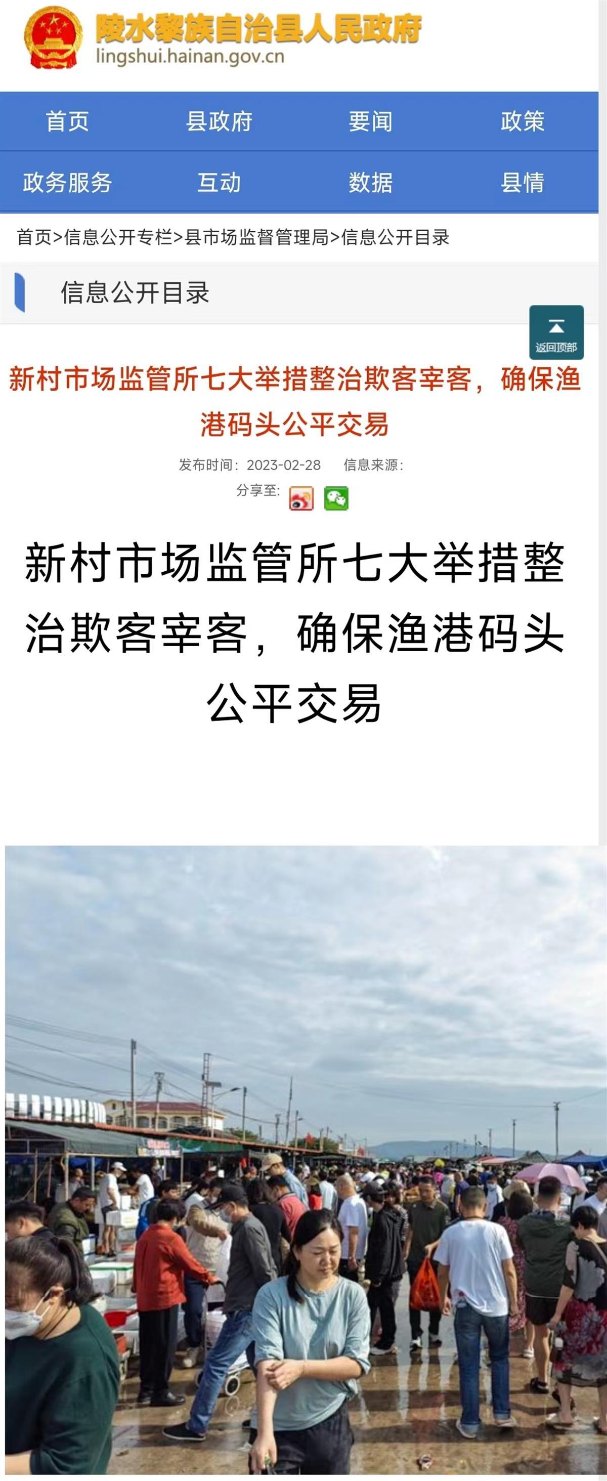 在陵水县人民政府官网上,一篇当地市场监管部门2月28日发布的文章中提到,新村渔港码头因海鲜品质较高,远近游客慕名而来。与此同时,各地流动鱼贩也云集于此,由于没有一个专门的第三方公司管理码头海鲜市场,缺斤短两、欺客宰客现象时有发生,成为引发舆情事件的重大隐患。为此,新村市场监督管理所主动作为、深入研判,推出七大举措整治缺斤短两、欺客宰客现象,取得了显著的成效。粗略统计,新村市场监督管理所春节期间仅通过快速投诉电话解决的现场投诉就多达70余起,为消费者挽回经济损失超过5万元。此外,还曾联合镇综合执法中队将恶意欺诈消费者的6个档口10余个不法商贩驱离码头,有效净化了市场。