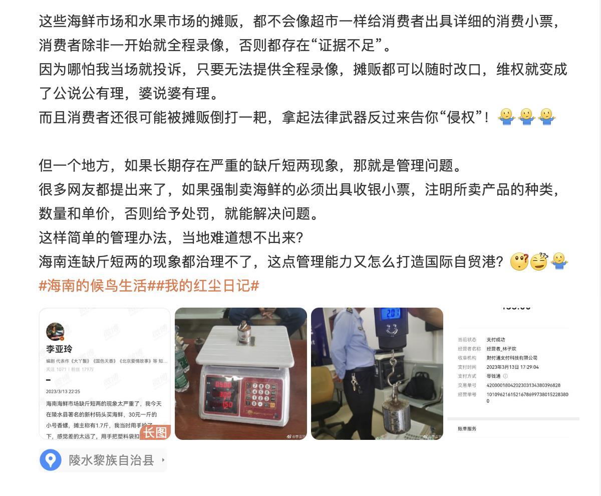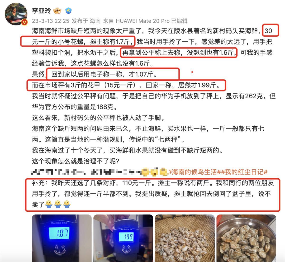 3月13日,知名编剧李亚玲发布微博称,当天,她在海南省陵水县新村码头购买海鲜时,遭遇了缺斤少两的情况。