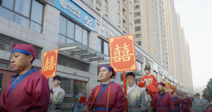 配上敲锣打鼓的乐队,现场热闹得宛若古代大户人家八抬大轿娶妻迎亲。