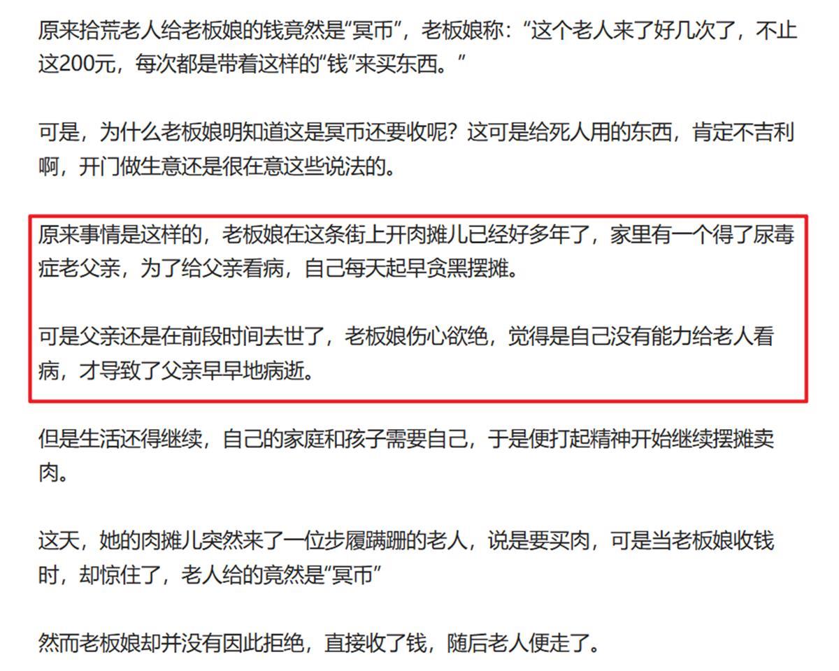 苏先生说,3月16日,有一个名为“朝经沐史”的自媒体号在网上发布的文章,让他十分气愤。文章称,好心老板娘吕女士的父亲几年前得了尿毒症,“为了给父亲看病,老板娘每天起早贪黑摆摊。”文章还称,老板娘的父亲于前段时间不幸去世,老板娘伤心欲绝,觉得是自己没有能力给父亲看病,才导致了父亲早早地病逝。那天老板娘接受拾荒者的冥币“卖”其一块羊肝,看着拾荒者的背影,老板娘又想起了自己死去的父亲,还想起了父亲此前对自己的教导。