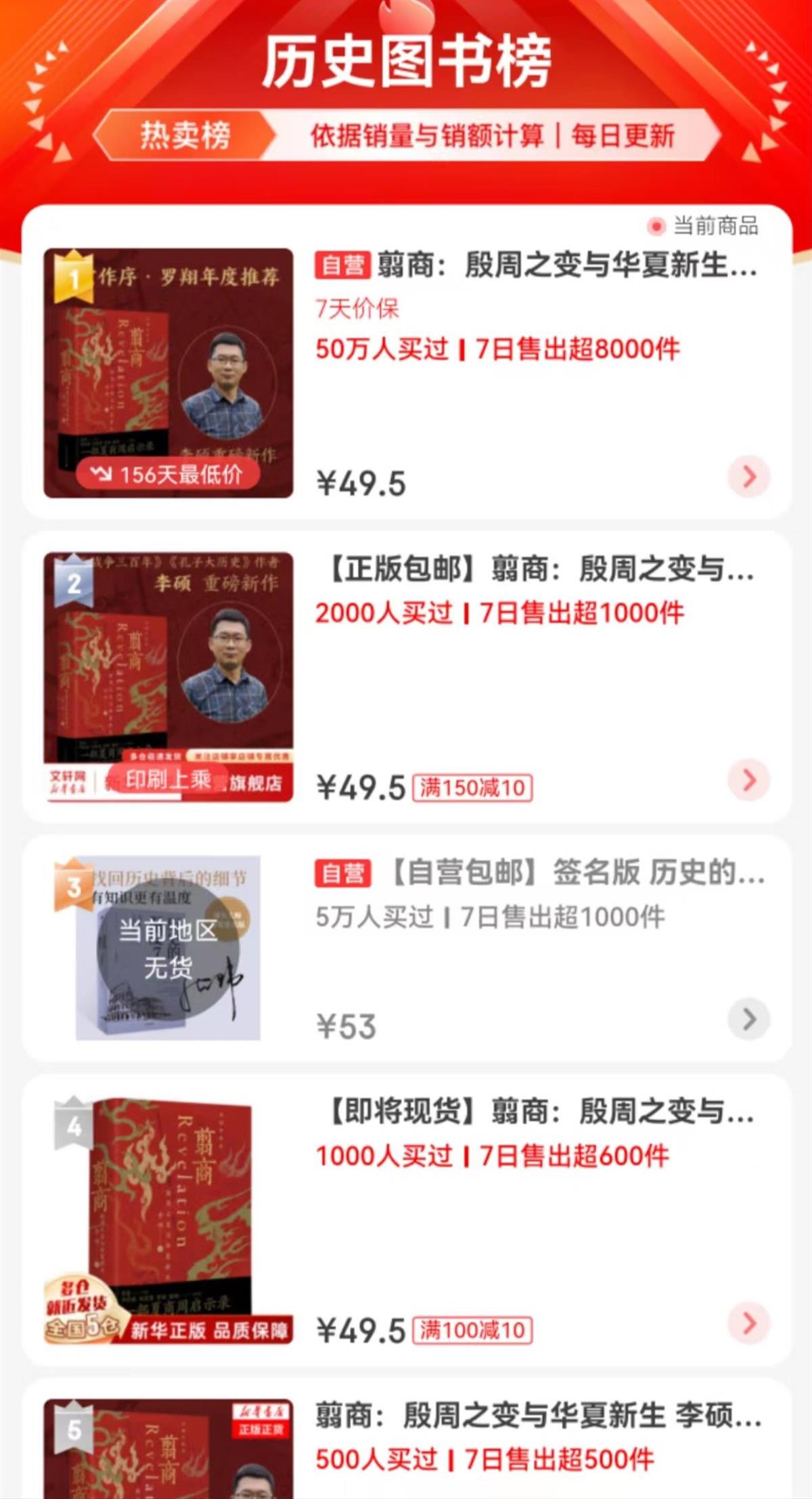 极目新闻记者联系李硕的多个友人,均表示已知晓此事,李硕在朋友圈中说自己不愿意被多打扰,所以也暂时也没去打扰他。记者注意到,在某网购平台上,李硕所著《翦商》已登顶17日历史图书榜,一周内售出超过8000件,另有多本书籍在榜。有人购买后评价“人们不该忘了他”。