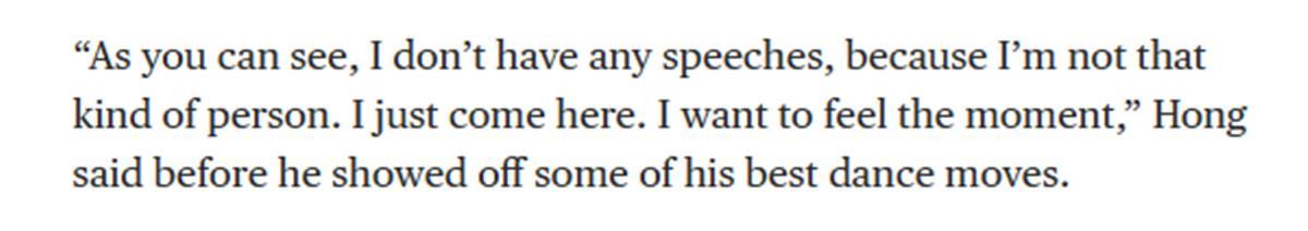 “如大家所见,我没有什么演讲,因为我不是那种人,我来这里只是想感受这一刻。”吴汉章在展示他的舞蹈动作前这样说道。
