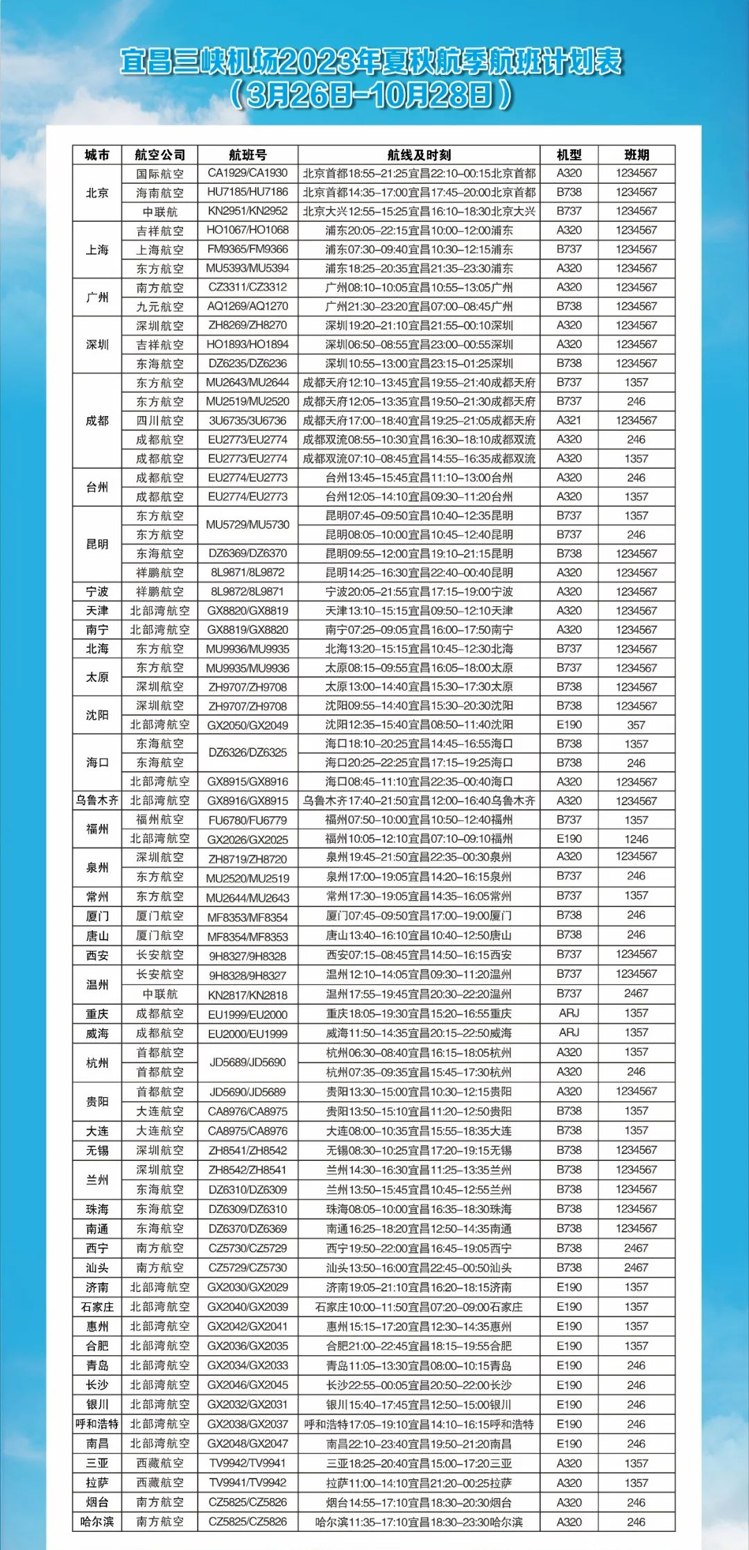 新开哈尔滨-宜昌-烟台,每周二、四、六执行共三班。