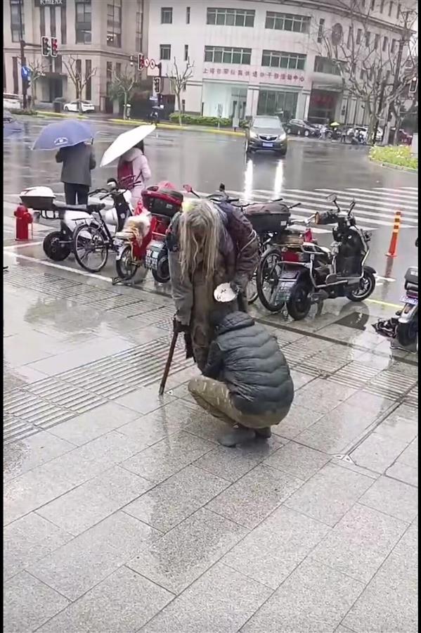 另一段视频显示,那位长发流浪老人光着脚站在路边,其所处位置为上海市徐汇区肇嘉浜地铁站附近。
