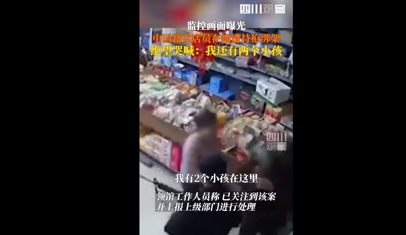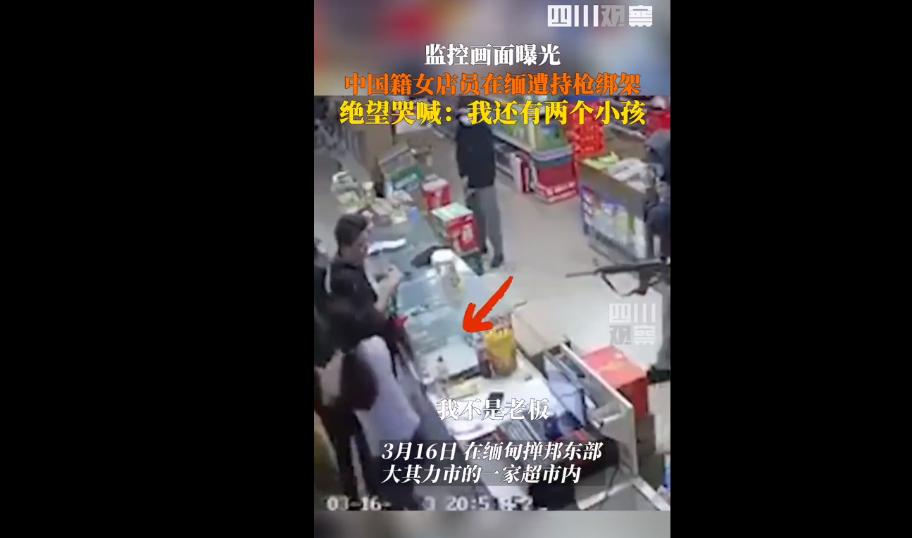 3月16日,缅甸掸邦东部大其力市。一超市内,中国女性店员遭4名蒙面歹徒持枪绑架,大声哭喊:“我还有2个小孩在这里!”领馆回应在缅中国女店员遭绑架:已关注到该案,并上报上级部门进行处理。缅甸媒体称,绑匪的身份仍然不明,不排除熟人作案的可能。