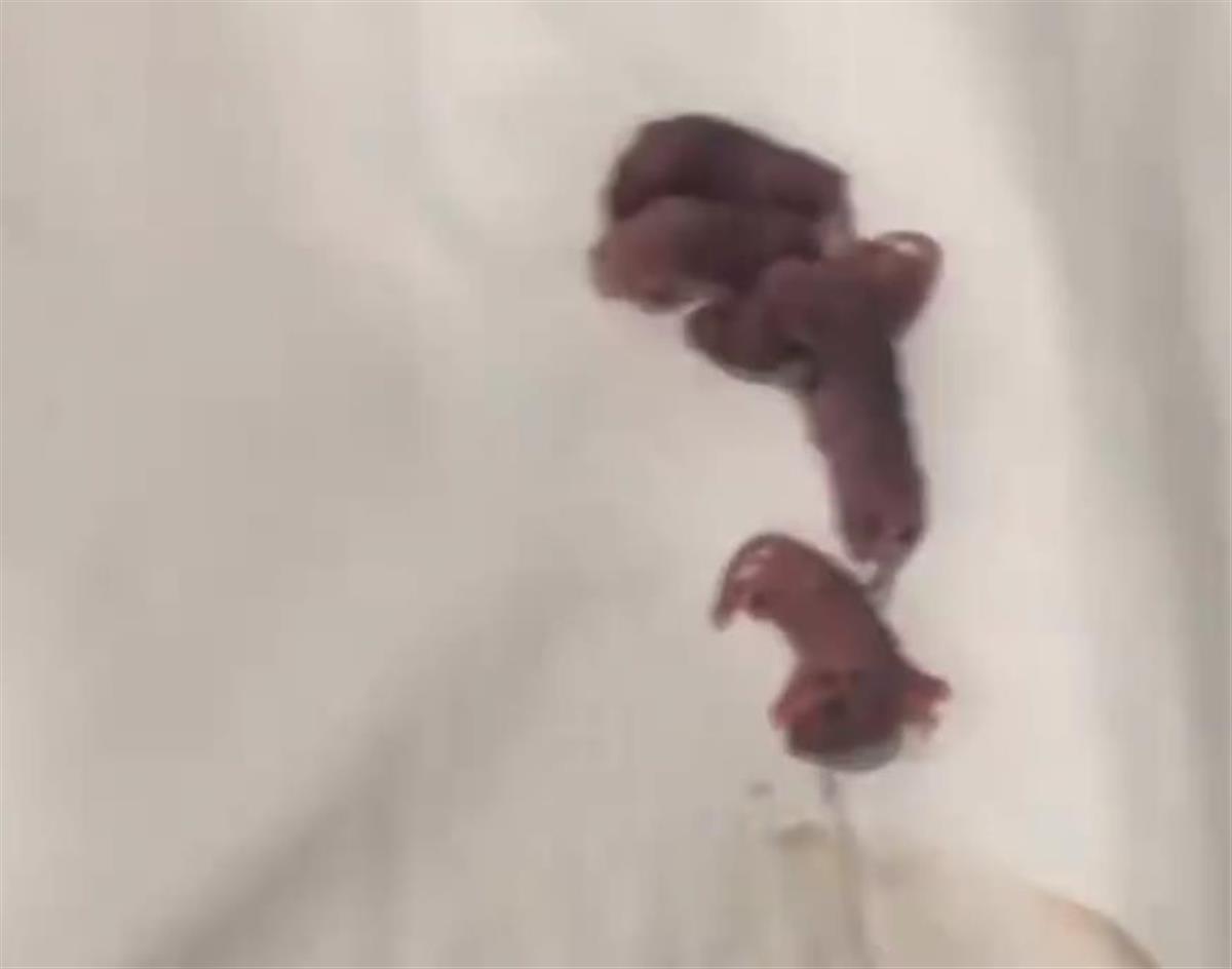 通过陈先生发布的现场视频,极目新闻记者看到,在酒店床上,有5只老鼠幼崽,枕头和床单上还疑似有红色血迹。
