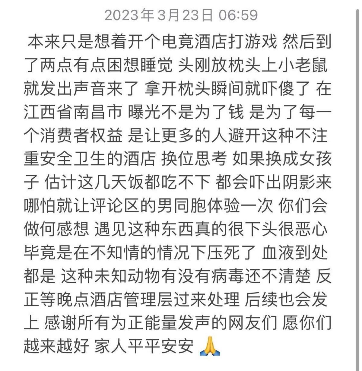 陈先生介绍,3月22日,他在南昌市战网电竞酒店开了一间房,本来只是想开个房间打游戏,等到了23日凌晨2点多的时候,他感觉有些困,便上了床准备睡一觉。然而,他刚把头靠在枕头上,就发现枕头下面发出了声音,“拿开枕头的瞬间我都吓傻了,竟然有一窝小老鼠!”