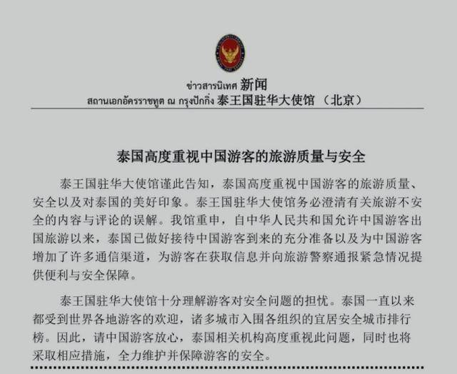 据泰王国驻华大使馆发布的《泰国高度重视中国游客的旅游质量与安全》显示,泰国已做好接待中国游客到来的充分准备以及为中国游客增加了许多通信渠道,为游客在获取信息并向旅游警察通报紧急情况提供便利与安全保障。泰王国驻华大使馆十分理解游客对安全问题的担忧。泰国一直以来都受到世界各地游客的欢迎,诸多城市入围各组织的宜居安全城市排行榜。因此,请中国游客放心,泰国相关机构高度重视此问题,同时也将采取相应措施,全力维护并保障游客的安全。