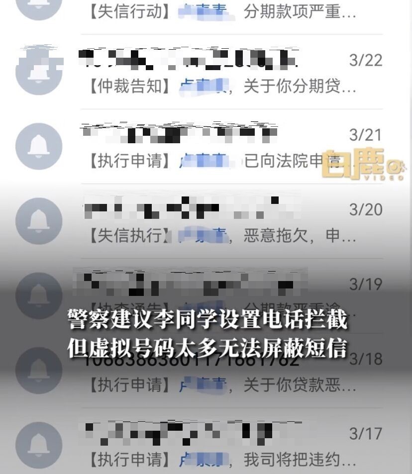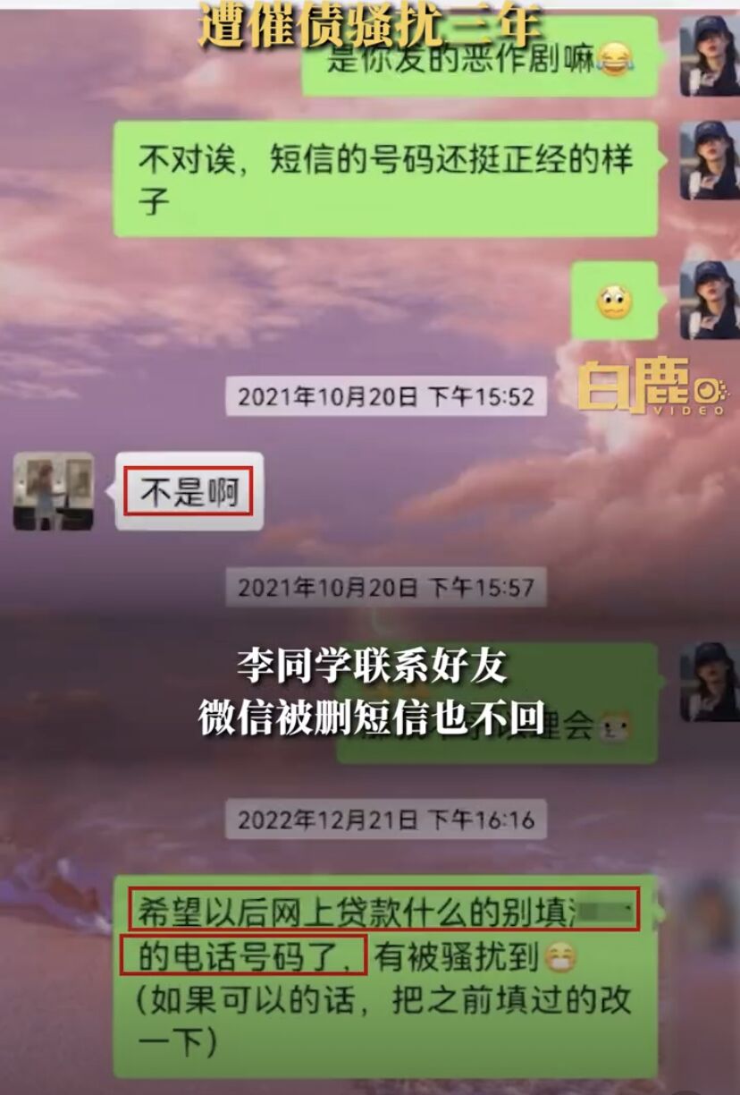 李同学讲述,是好友在某个平台借款填了李同学的联系方式,所以从2021年10月份收到讨债电话和催收信息至今,李同学称,发现后就立即联系好友,好友否认,后来自己微信被删短信也不回。