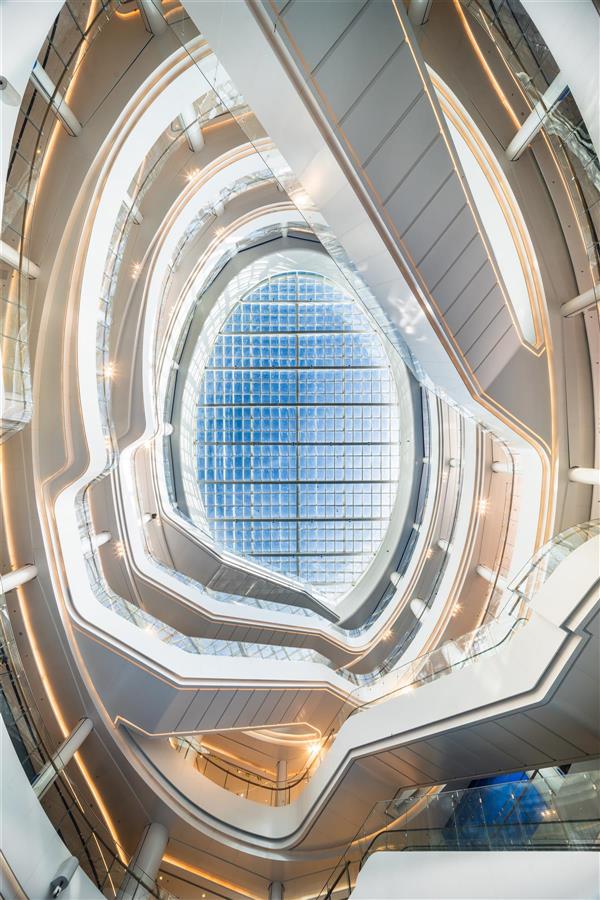 楼顶花园视野开阔,户外平台疏朗透气。透明的中央穹顶和精妙的采光设计,让阳光曼舞,既绿色环保,又令人心情愉悦。