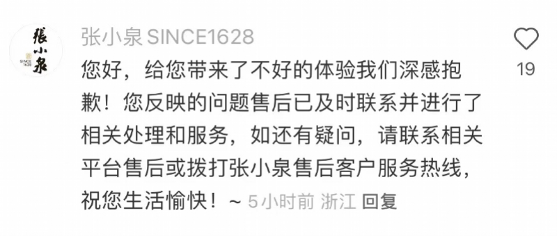 3月29日,张小泉官方账号在该条网帖下回复称,“给您带来了不好的体验我们深感抱歉,售后已及时联系并进行了相关处理和服务。”记者注意到,上述消费者曝光的断裂斩骨刀是全钢的,有客服人员指出,“全钢的硬,但越坚硬的物品,韧性却不高。”