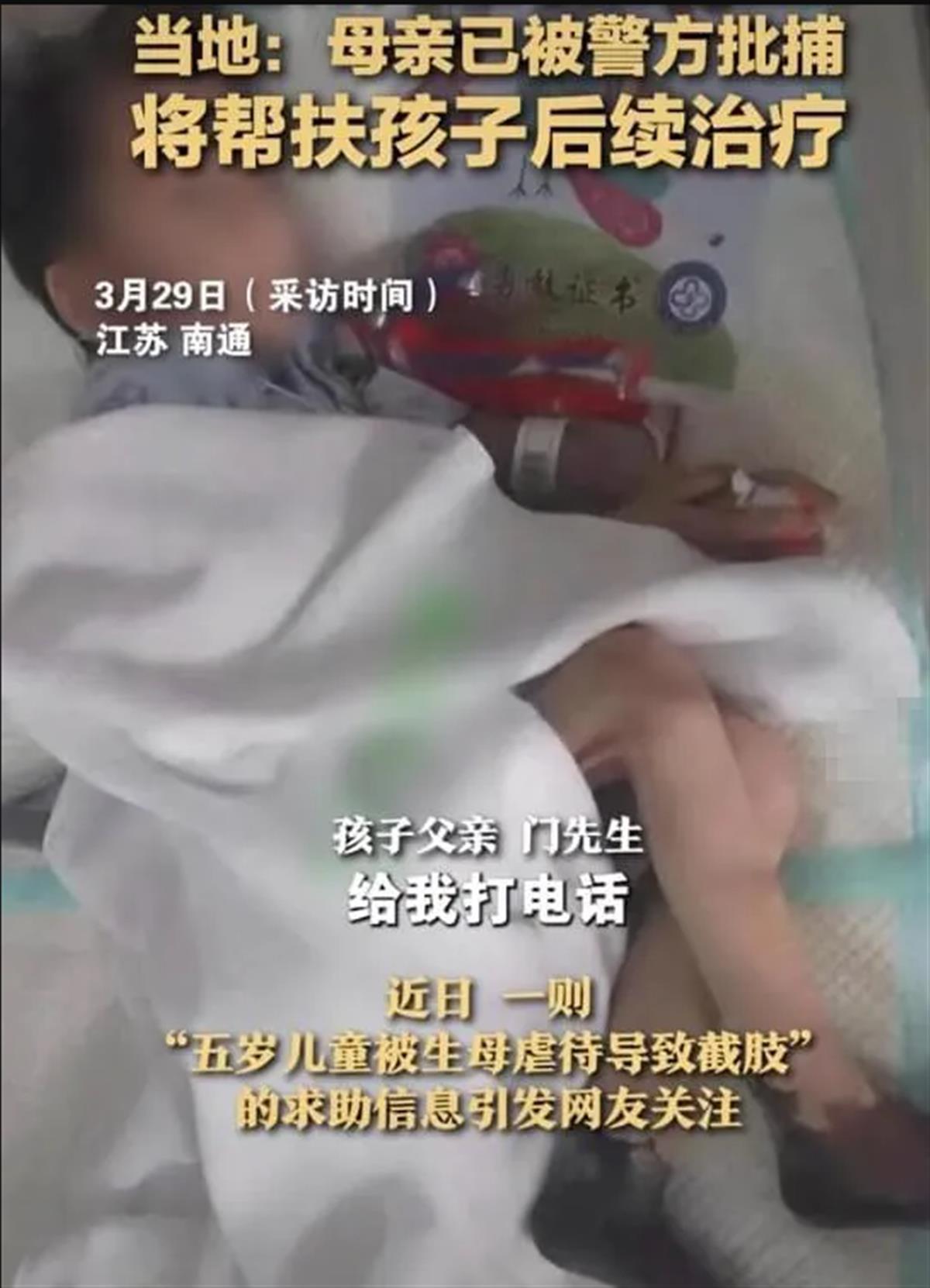 近日,有媒体报道,江苏南通市通州区平潮镇一名男童被亲生母亲虐待,父亲称男童被虐待致截肢。平潮镇政府称,目前男童母亲已被批捕。(据3月31日澎湃新闻)