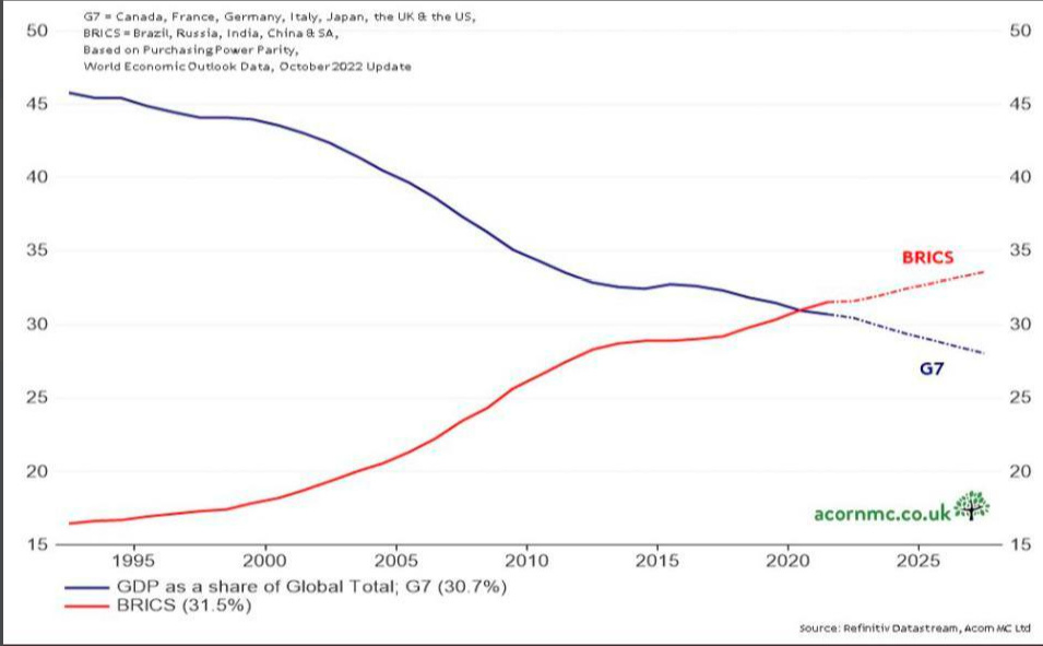 就在不久前,国际货币基金组织发布的《世界经济展望报告》显示,按照购买力平价计算,截至2022年10月,金砖五国在全球GDP中所占份额已经超过了G7。