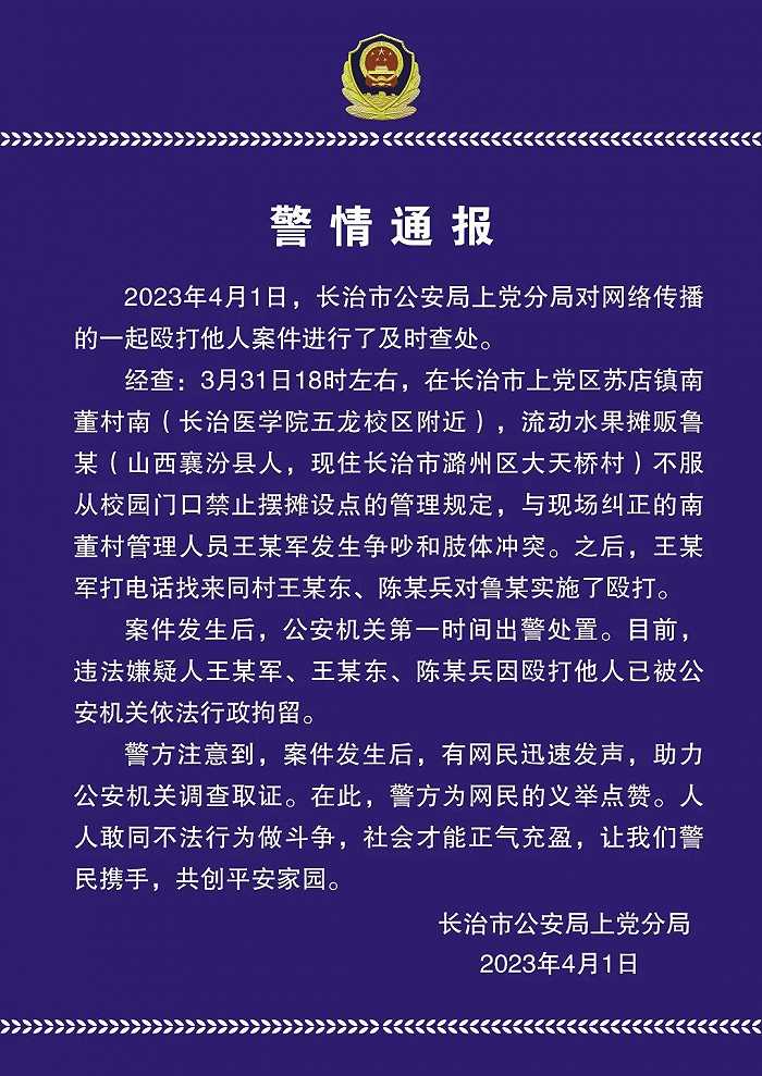 4月1日,山西长治市公安局上党分局通报,经查,3月31日18时左右,在长治市上党区苏店镇南董村南(长治医学院五龙校区附近),流动水果摊贩鲁某(山西襄汾县人,现住长治市潞州区大天桥村)不服从校园门口禁止摆摊设点的管理规定,与现场纠正的南董村管理人员王某军发生争吵和肢体冲突。之后,王某军打电话找来同村王某东、陈某兵对鲁某实施了殴打。案件发生后,公安机关第一时间出警处置。目前,违法嫌疑人王某军、王某东、陈某兵因殴打他人已被公安机关依法行政拘留。