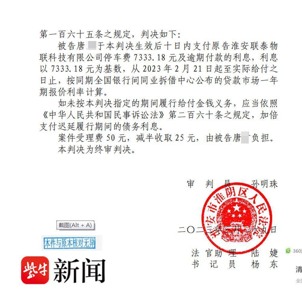 因欠缴停车费,唐某被法院判决支付停车管理方7333.18元停车费。