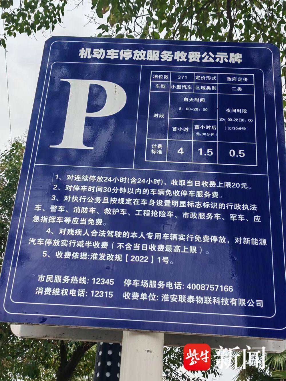 在淮安市区,部分道路划有停车收费泊位,而且路边摆放机动车停放服务收费公示牌,并在公示牌上标明计费标准及收费依据。
