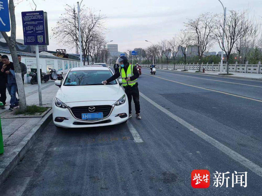 停车管理员对停放在收费泊位内机动车张贴缴费通知单。