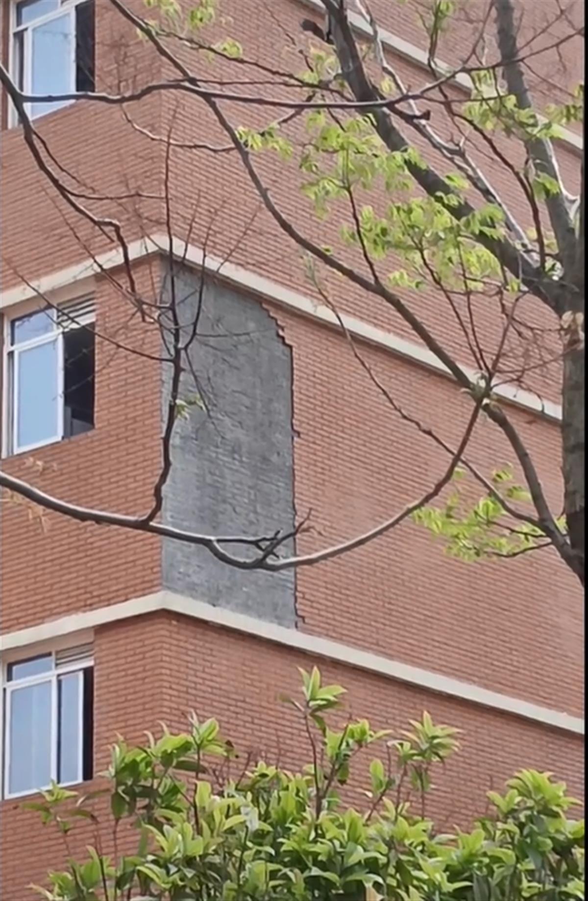 视频显示,事发教学楼高约6层,发生脱落的外墙位于第四层,脱落的外墙面积有数平方米。