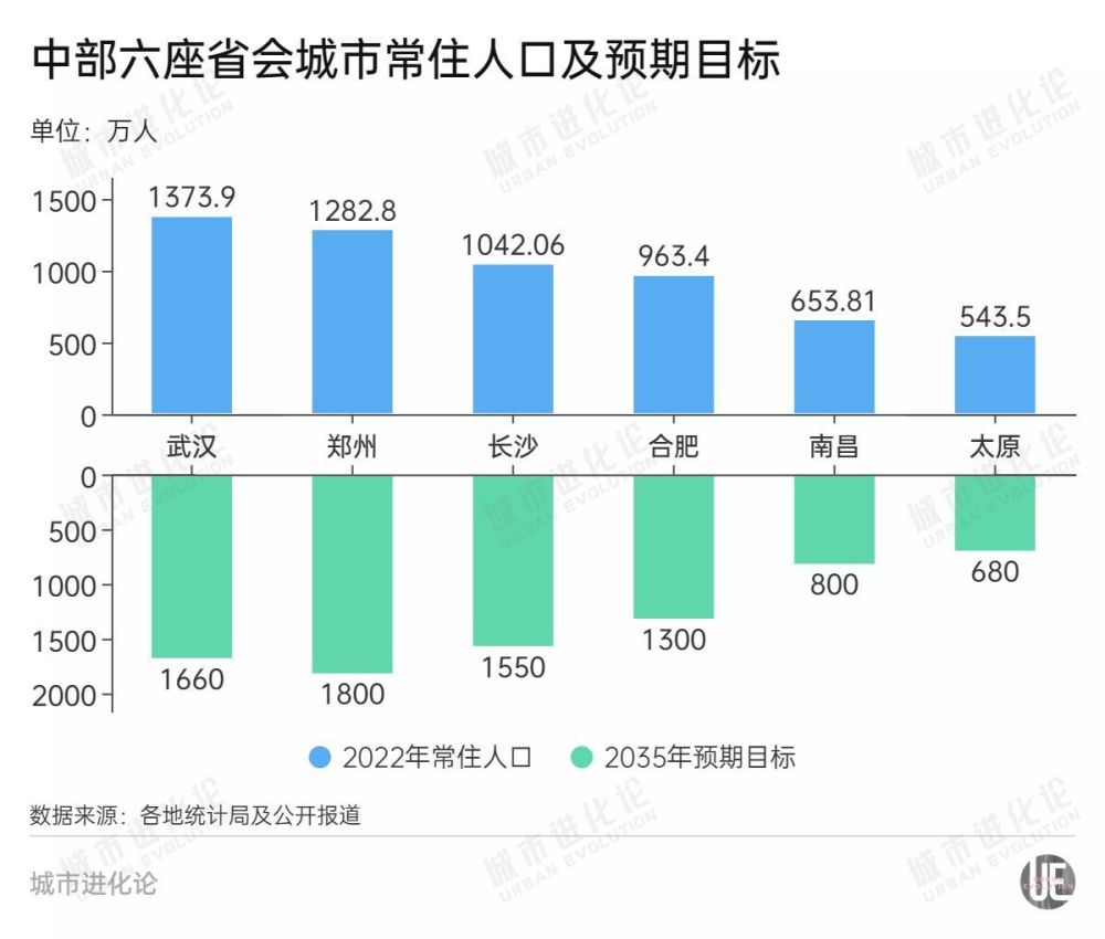 从各地总体规划看,2035年,武汉规划人口为1660万,郑州为1800万,长沙1550万,合肥1300万,南昌800万,太原680万。