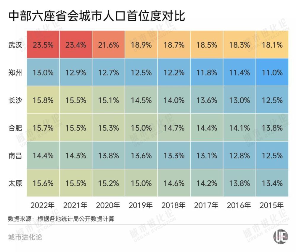 数据显示,2015年,长沙人口首位度仅为12.5%,不及武汉、合肥、太原、南昌;到2022年,长沙人口首位度已提升3.3个百分点至15.8%,在中部六城中仅次于武汉。