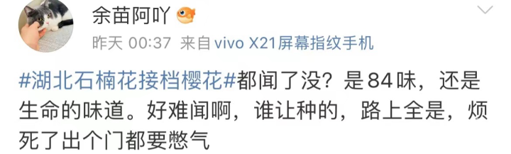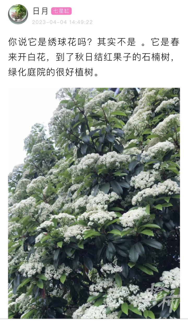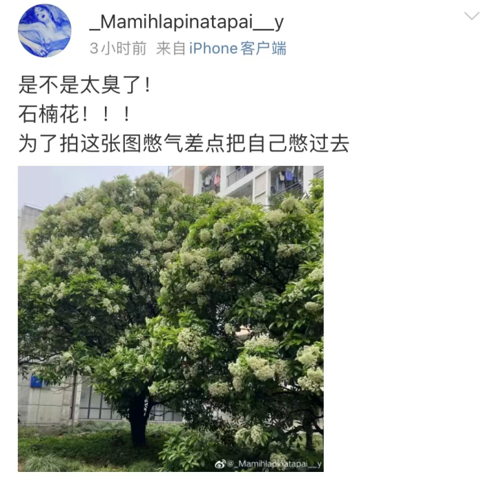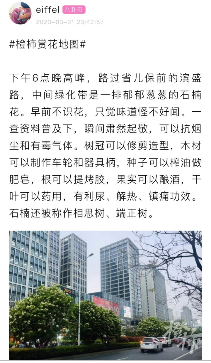 橙友圈里,橙友“朱二”就发来吐槽说,“今年的石楠气味相当腥臭,环城东路遭殃”。